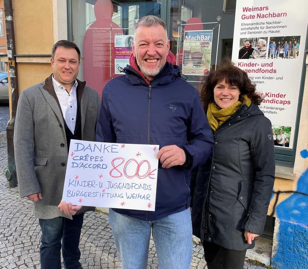 Der Erlös des letzten Verkaufstags auf dem Weihnachtsmarkt wird traditionell an ein gemeinnütziges Projekt in Weimar gespendet. Wir danken ganz herzlich Ansgar und Conny Brokamp (Crêpes-Stand auf dem Weimarer Marktplatz), dass die Bürgerstiftung in diesem Jahr als Empfänger erwählt wurde.