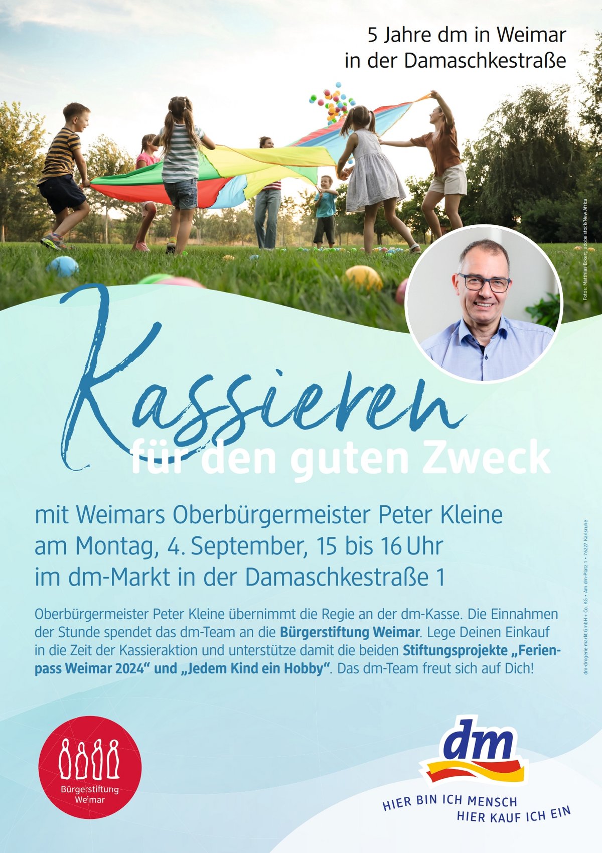 Nicht nur die Projekte der Bürgerstiftung Weimar profitieren von der Jubiläumsaktion des dm Drogeriemarkts in Weimar, bei der Oberbürgermeister Peter Kleine eine Stunde lang die Kasse bediente.