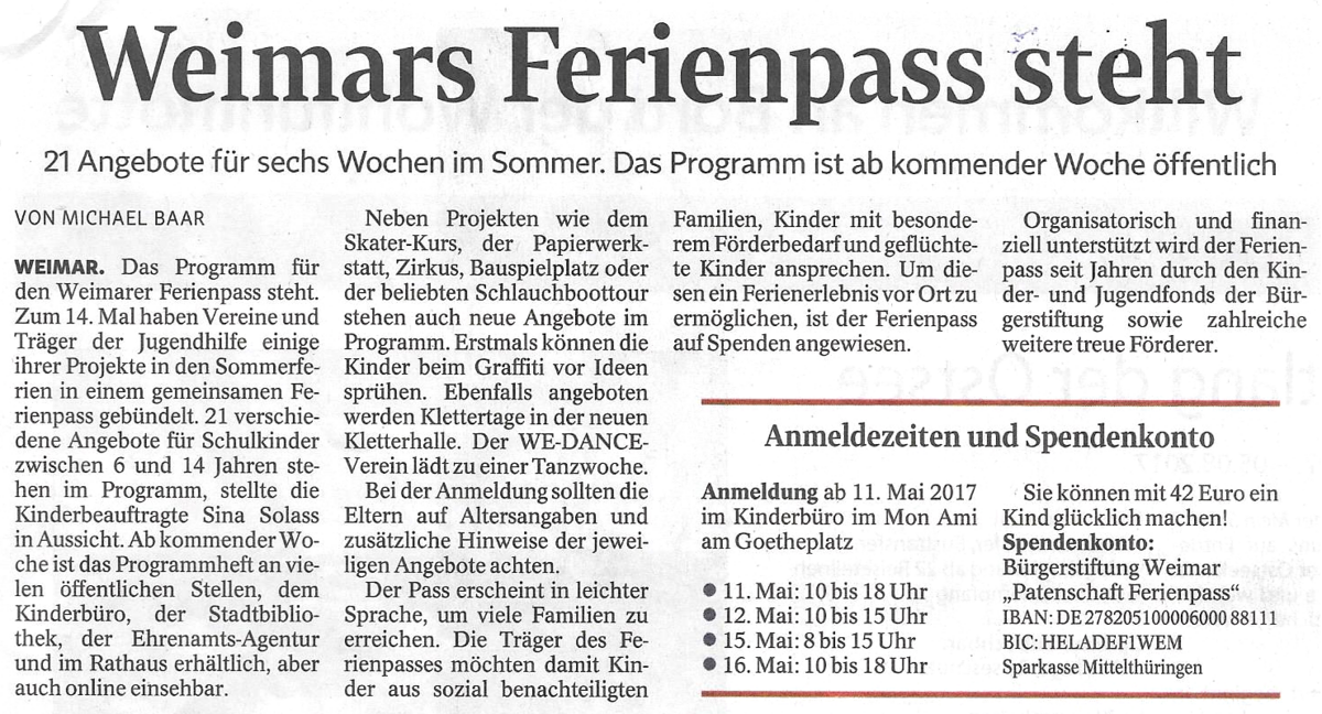 Ferienpässe liegen in vielen öffentlichen Einrichtungen aus. Anmeldung startet am 11. Mai im Kinderbüro (Mon Ami) am Goetheplatz.