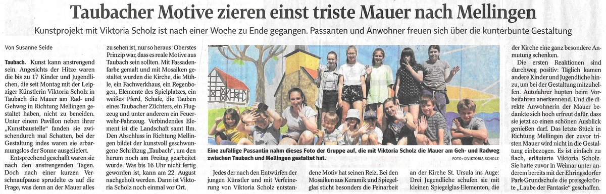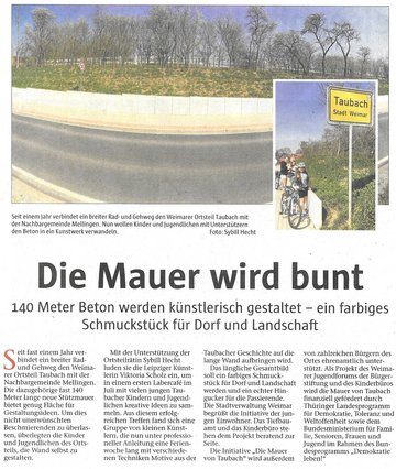 (...) als Projekt des Weimarer Jugendforums der Bürgerstiftung des des Kinderbüros wird die Mauer von Taubach finanziell gefördert durch das Thüringer Landesprogramm für Demokrtie, Toleranz und Weltoffenheit. (...)
