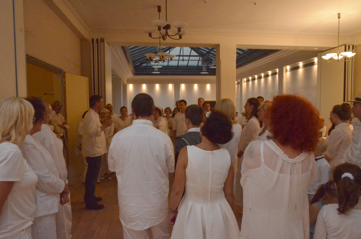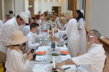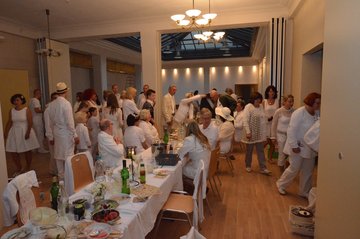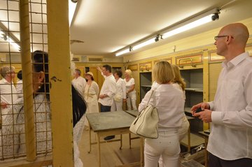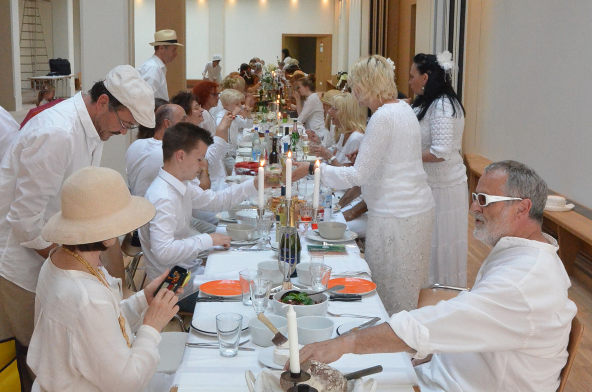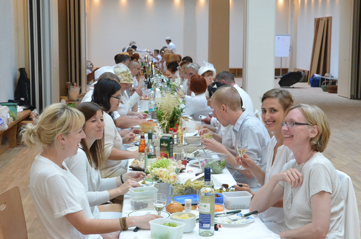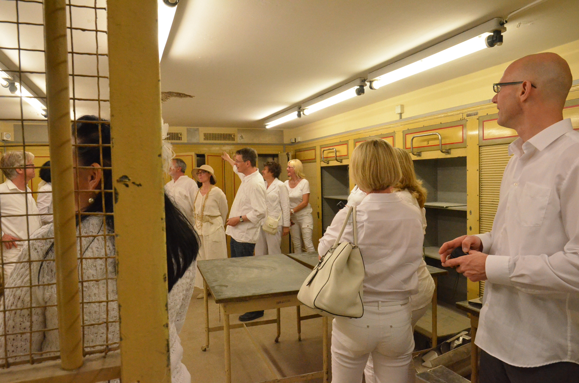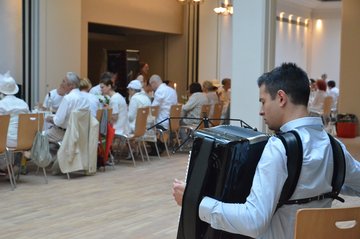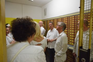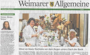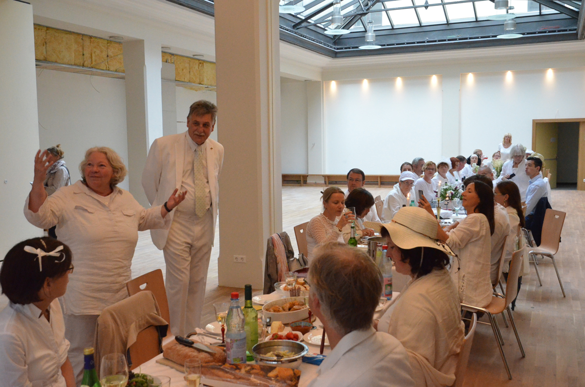 Wetterbedingt fand das Diner statt auf dem Frauenplan im überdachten Domizil der "Notenbank" in der Steubenstraße statt. Ca. 70 gut gelaunte Menschen fanden sich ein, um reichlich zu dinieren. Das außergewöhnliche Event wurde ergänzt mit Kultur (Akkordeon) und Bildung (Führung von Anselm Graubner durch die Tresorräume der ehemaligen Staatsbank).