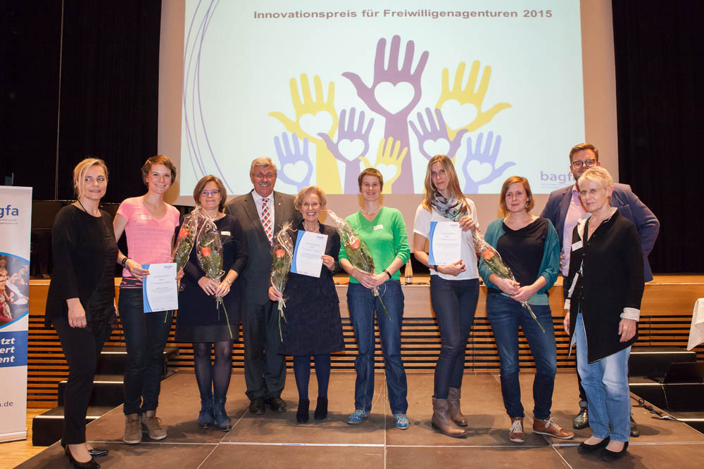 Zum Auftakt ihrer Jahrestagung vergab die Bundesarbeitsgemeinschaft der Freiwilligenagenturen (bagfa) unter dem Motto „Für Engagement begeistern“ Anfang November den Innovationspreis für Freiwilligenagenturen 2015. Fünf Freiwilligenagenturen wurden mit dem mit 2.000 Euro dotierten Preis ausgezeichnet:
