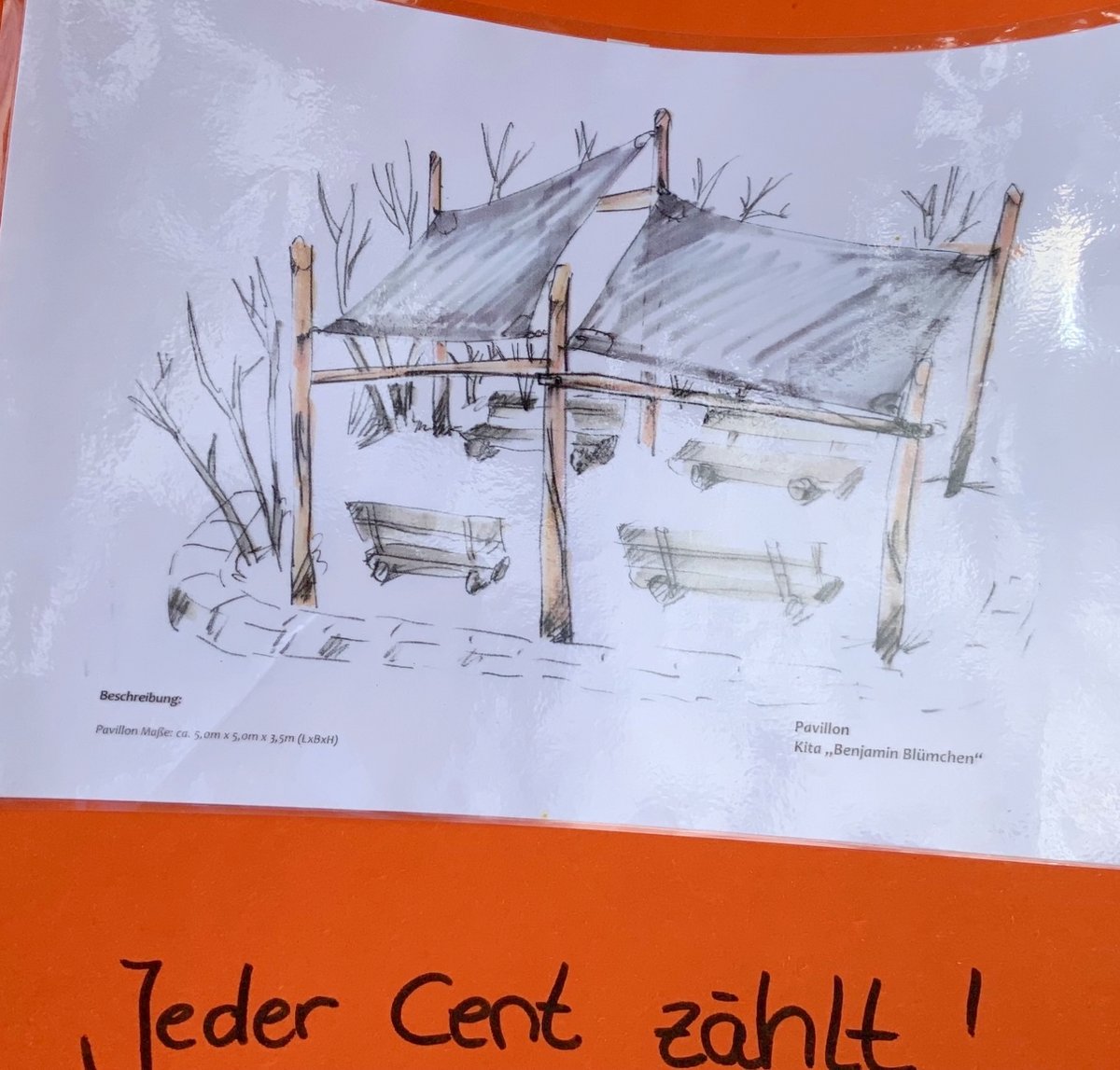 Noch fehlt ein Teil des Gesamtbetrages, aber schon bald werden die Kinder bei Regen oder Sonnenschein ihre Zeit draußen verbringen können. Der überdachte Platz zum Essen, Basteln und Spielen bei Wind und Wetter, ist ein langgehegter Wunsch des naturnahen Kindergartens.