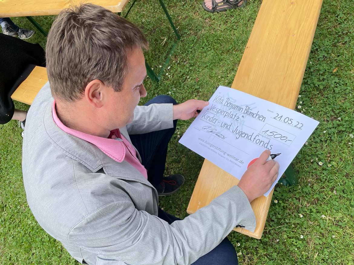 Dank der spendenfreudigen Besucher und der Bürgerstiftung Weimar wurden 3.700 € für das Projekt eingeworben. 1.200 € brachte allein der Erlös aus Kuchenverkauf und den Spenden vor Ort. Jeder dieser Spenden-Euros wurde wiederum vom Kinder- und Jugendfonds der Bürgerstiftung verdoppelt und auf 1500 € aufgerundet. René Röthlich vom Stiftungsrat übergab persönlich den Spendenscheck über die Summe am 21.5.22.
