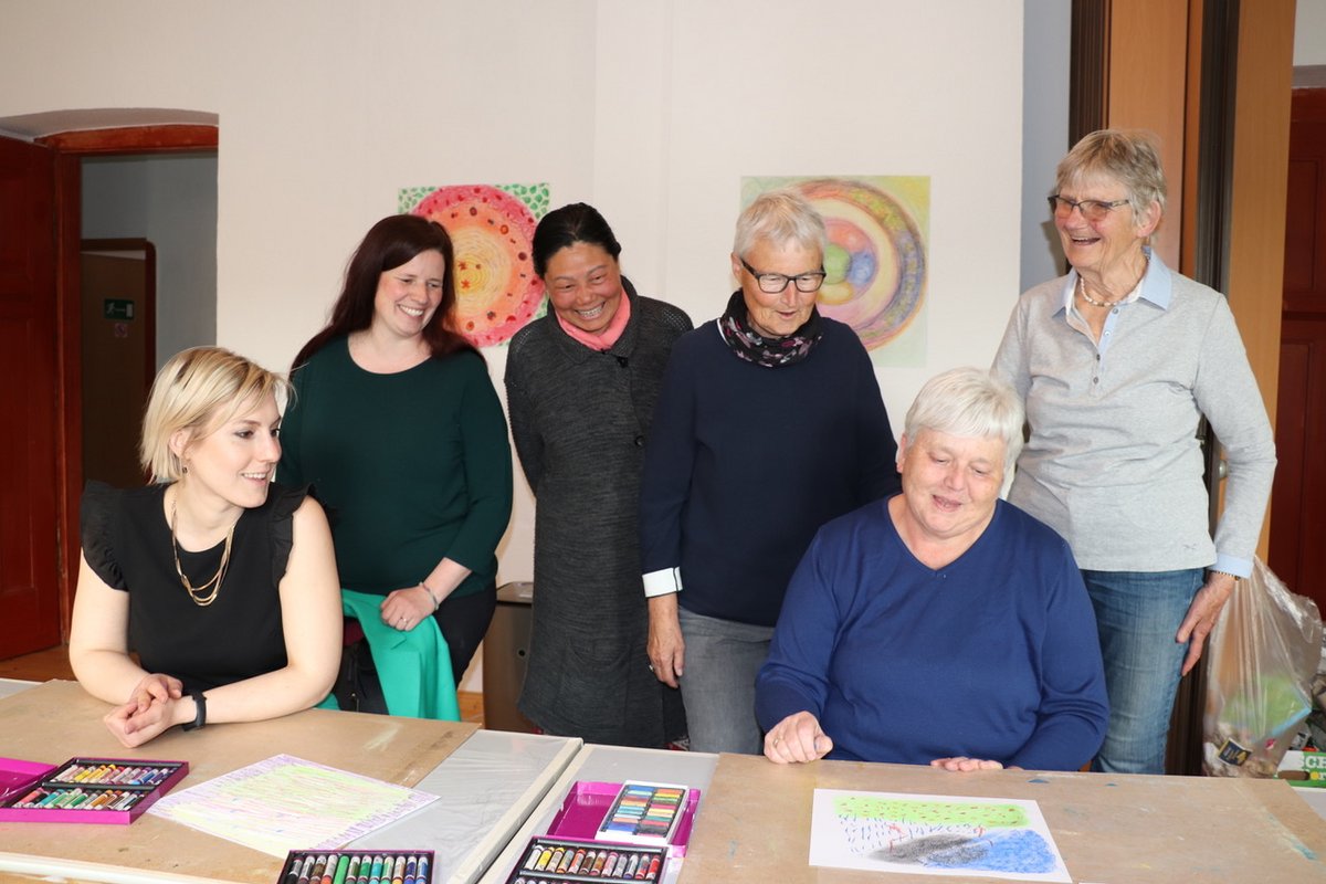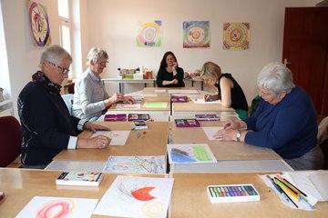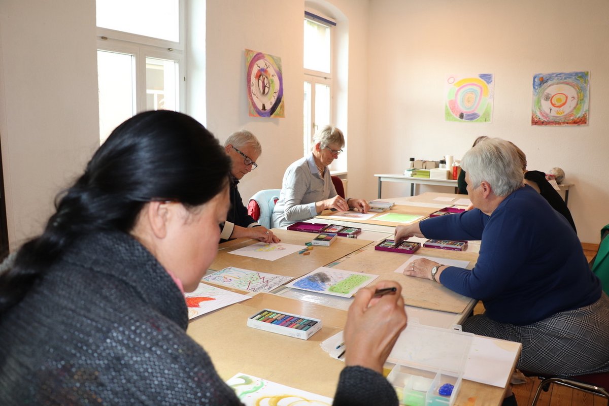 Der von Nadine Wehrli geleitete Kreativ-Kurs, der im 14-tägigen Rhythmus immer donnerstags an der Johanna-Schopenhauer-Straße stattfindet, führt die Frauen immer auch ein Stück weit zu sich selbst. „Wir nehmen uns immer ein Thema vor“, informiert die Künstlerin und Kunsttherapeutin Nadine Wehrli. Nach einer einleitenden Farbübung näherten sich die Teilnehmerin im vierten von zehn Kursabenden am Donnerstag mit Pastellkreiden, Wachsstiften oder Aquarellfarben dem Thema „Körper“. Gefordert sind keine künstlerischen Höchstleistungen, vielmehr soll Geist und Seele in den zwei Kursstunden eine Auszeit gegönnt werden.