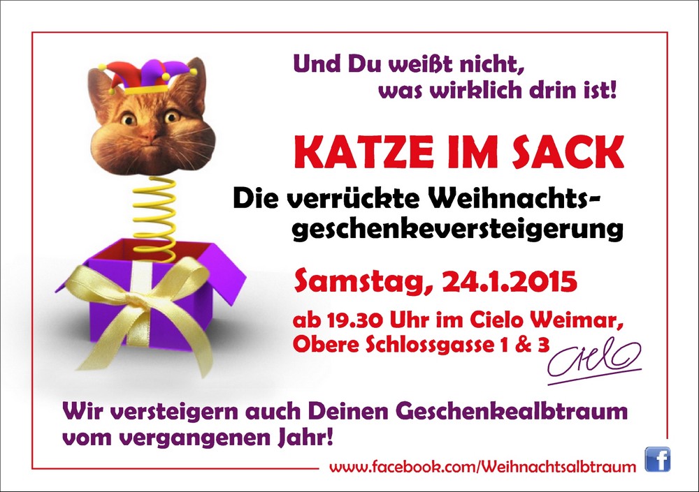 Schon 2008 haben die Beiden mit großem Erfolg einen Riesenberg verpackter Geschenke für uns an den Mann gebracht. Lasst Euch dieses witzige Event nicht entgehen! Ihr könnt eigene ungeliebte Weihnachtsgeschenke zu Gunsten der Bürgerstiftung Weimar versteigern lassen und dafür echte Schnäppchen mit nach Hause nehmen. Unter allen Steigernden werden drei Hauptpreise verlost, gespendet von Künstler Dieter M. Weidenbach, Kulturspion (Kulturfestival Paulinzella) und dem Berghotel Eisenach.