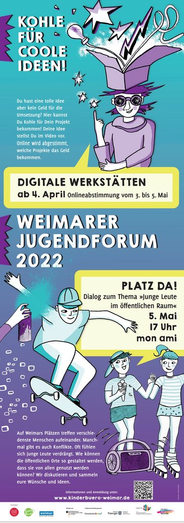 Vom 4. bis 27. April lädt das Kinderbüro zu individuellen Werkstatt-Treffen ein. Diese können vor Ort oder digital stattfinden. Ein Termin wird nach den Wünschen der Interessenten vereinbart. In den Werkstätten werden die Ideen besprochen und gemeinsam wird ein Projektantrag erstellt. Dann geht es an die Erarbeitung eines Videos. Unterstützt von der Medienpädagogin Marie Bielefeld werden zu allen Projektanträgen Vorstellungs-Clips zusammengestellt. Diese werden ab dem 2.5.2022 online zu sehen sein. Dann können alle jungen Weimarerinnen und Weimarer bis zum 5.5. 2022 darüber abstimmen, welche Projektideen ihnen am besten gefallen. Gefördert werden die Projekte mit den meisten Stimmen.