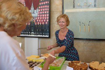 Die „Guten Nachbarn“ der Bürgerstiftung Weimar freuen sich über das großartige Engagement der Mitarbeiterinnen und Mitarbeiter des DNT. Diese haben gebacken und Ihr großartiges Gebäck gegen eine Spende verteilt. Kuchen kamen auch von Stifter*innen der Bürgerstiftung Weimar, von den „Guten Nachbarn“, von der Kuchenmanufaktur Koriat und der Brotklappe in allen Formen und Variationen. Auch Hasko Weber (Intendant des DNT) und Doris Elfert (Vorstandsvorsitzende der Bürgerstiftung) ließen es sich nicht nehmen, die Kuchen an Mann, Frau und Kind zu bringen. Um 17 Uhr war die Kuchentafel leergefegt. Wir danken allen Beteiligten und freuen uns über 587,96 Euro Spenden für das ehrenamtliche Seniorenprojekt „Weimars Gute Nachbarn“. Die 26 Seniorenbegleiter*innen suchen immer Verstärkung. Denn alleinlebende Seniorinnen und Senioren die sich einen regelmäßigen Besuch wünschen, gibt es viele in Weimar.