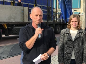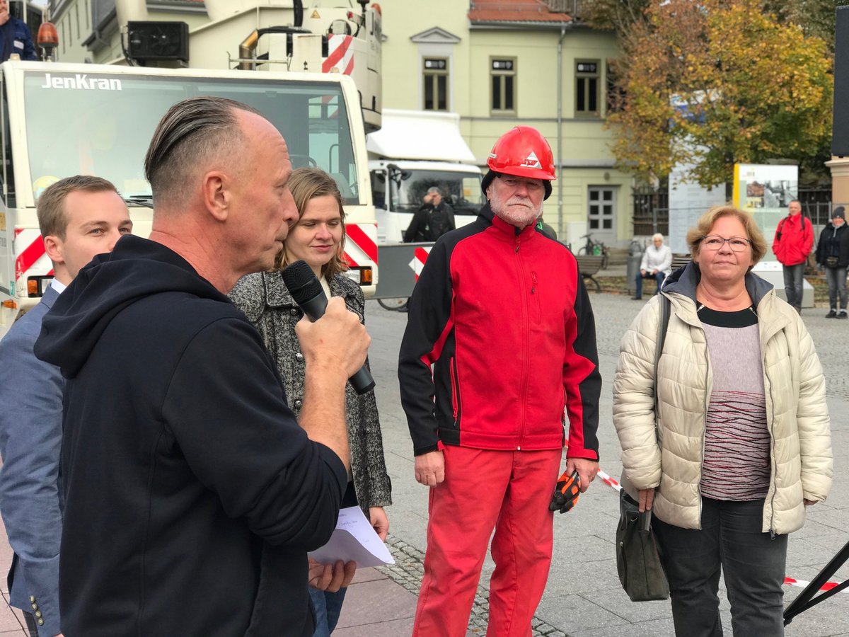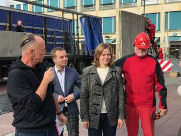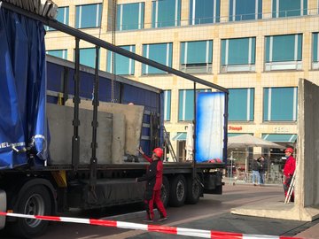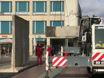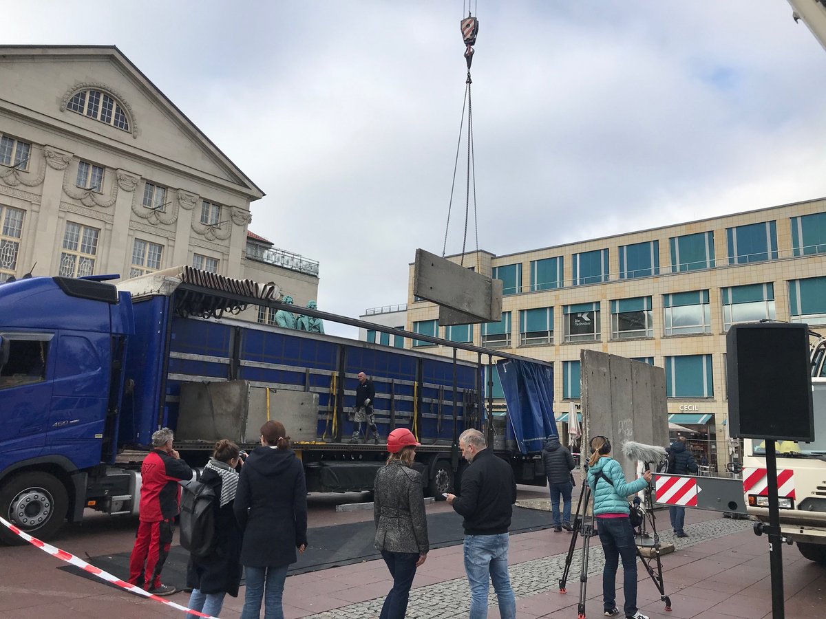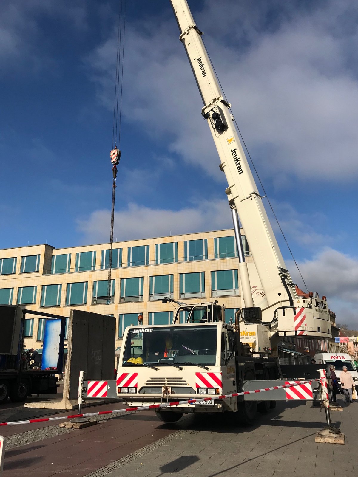 Unterstützt von Klaus Deininger und Mitarbeitern der KTW sowie der BB Beton und Bauwaren GmbH, vertreten von Konrad Henke, wurde am 28.10. die temporäre Mauer auf dem Theaterplatz errichtet. 17 Betonsegmente, die von Künstlerin Christina Wildgrube in den kommenden Tagen gestaltet werden. Die einzelnen Teile der Mauerinstallation sind ab sofort für ein Spende ab 500 Euro zu bekommen (Kontakt: Mareike Hage / intendanz[at]nationaltheater-weimar.de). Der Erlös kommt dem Kinder- und Jugendfonds der Bürgerstiftung Weimar zugute. Um den einigenden Gedanken auch über den Zeitraum der Installation hinaus zu verankern, ist die Aufstellung der einzelnen Mauerteile im Weimarer Stadtbild geplant.