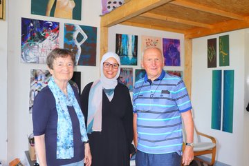Erstmals lernte das Ehepaar dabei auch die ägyptische Künstlerin Omneya Khalil und ihre Werke kennen. Ausführlich standen Omneya Khalil und ihr Mann den Besuchern Rede und Antwort und gaben Auskunft zum künstlerischen Werdegang und zu den Werken. Aus dem Fonds war die Miete für Omneyas Atelier für ein halbes Jahr übernommen worden. Wer Omneya Khalils Werke kennenlernen möchte, hat dazu ab Sonntag, 26. Juni, 19 Uhr, und bis 8. September in der Sommerausstellung „Vielfalt und Austausch“ in der Kirche in Tiefengruben Gelegenheit. Und erfährt dabei gleichzeitig auch, dass das Geld aus dem Fonds von den Erben ganz im Sinne Margarethe Geibels bestens angelegt ist und eine junge Künstlerin auf ihrem Weg in eine erfolgreiche Zukunft unterstützt.