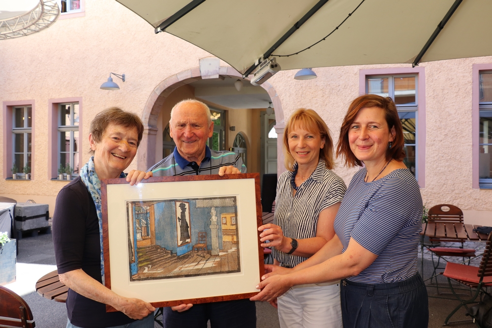Ihr Großvater stamme aus Weimar, ihre Großtante Margarethe Geibel (1876-1955) studierte an der Weimarer Mal- und Zeichenschule bei Otto Rasch, begründet Dorothea Schmeißner-Lösch, warum sie den Fonds bei der Weimarer Bürgerstiftung ansiedelte. Im Familienbesitz und in Museen, so auch in Weimar, finden sich Werke von Margarethe Geibel heute. Leider waren bislang in Weimar alle Bemühungen um eine große Personalausstellung vergeblich, bedauert Dorothea Schmeißner-Lösch. Ein Holzschnitt, der das „Silhouettenzimmer“ im Goethehaus zeigt, lässt die Künstlerin künftig in den Räumen der Bürgerstiftung gegenwärtig sein: Dorothea Schmeißner-Lösch und Alfred Lösch überreichten das Werk Katrin Katzung und Anja Pfotenhauer-Wolleschensky bei ihrem Weimar-Besuch.