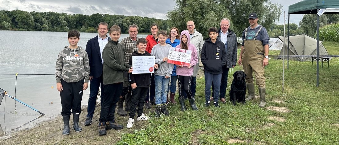 Pünktlich zum Pressetermin um 12.00 Uhr verzogen sich dann auch die fetten Regenwolken. Das Angelcamp am Kromsdorfer Speicher war Übergabeort der Förderungen. Ulla Hengst nahm als Vertreterin der Interessengemeinschaft gleich zwei symbolische Schecks entgegen. Neben dem Kinder- und Jugendfonds gibt die Sparkasse Mittelthüringen 2500 €.