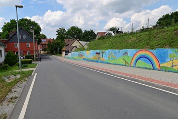 Sybill Hecht und Christian Brunkow führten uns vorbei an liebevoll restaurierten Höfen, dem Friedhof, dem alten Pfarrhaus und einer von Kindern kunstvoll gestalteten Stützmauer eines Radweges und wussten dabei viel Spannendes zu erzählen.