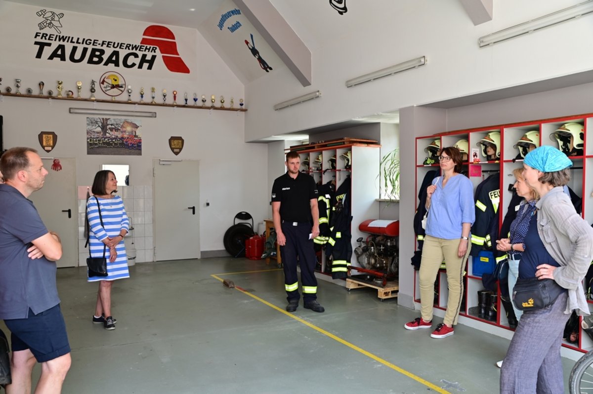 Die Taubacher Bürger hatten ein abwechslungsreiches und interessantes Programm vorbereitet und stellten viele Highlights des Ortes vor. So erzählte Brigitte Burckhardt vom Leben in Thüringens ältester verbriefter Mühle, die auch Taubachs Ursprung ist. Sybill Hecht und Christian Brunkow führten uns vorbei an liebevoll restaurierten Höfen, dem Friedhof, dem alten Pfarrhaus und einer von Kindern kunstvoll gestalteten Stützmauer eines Radweges und wussten dabei viel Spannendes zu erzählen. In der Freiwilligen Feuerwehr berichtete der Wehrleiter Thomas Uschkurat über die Aufgabenfelder und die technische Ausstattung. Zum Schluss konnten wir das Herzstück des Ortes, den Kirchplatz mit der wunderbar sanierten Kirche St. Ursula, bestaunen. Anneliese Eisenberg gab einen Einblick in die Geschichte und die Sanierung des Gotteshauses. Bei Kaffee und Kuchen klang der Nachmittag aus. Wer Lust hatte, besuchte anschließend noch die Vernissage der Ausstellung mit Bildern aus und über Taubach in der Kirche St. Ursula.